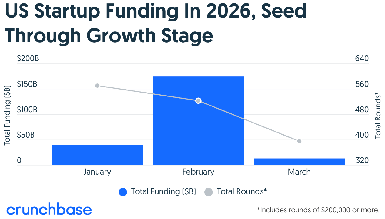U.S. startup funding fell sharply in March to around $13B, a steep drop from February’s record levels, driven primarily by the absence of mega-rounds such as OpenAI’s $110B, Anthropic’s $30B, and Waymo’s $16B. The slowdown is concentrated at the late stage, while seed and early-stage funding remained relatively stable compared to prior months. The decline also coincides with geopolitical tensions following the Feb. 28 Iran War and broader market volatility, which have weighed on investor sentiment and stock markets