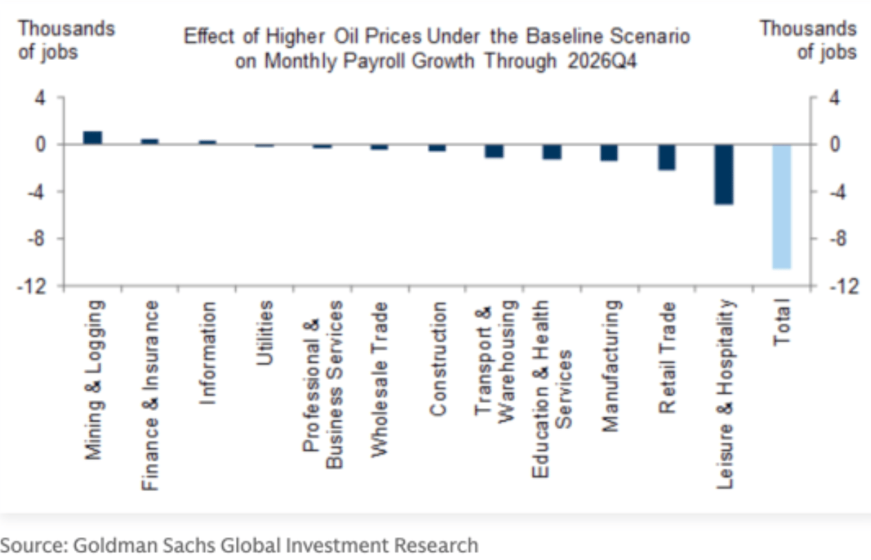 The U.S.-Iran conflict is expected to weigh on the U.S. labor market, with Goldman Sachs estimating a loss of ~10,000 jobs per month through year-end due to rising oil prices. Energy shocks could push Brent crude to $115–$140+ per barrel, driving higher consumer costs and reducing discretionary spending, particularly impacting leisure and hospitality (~5,000 jobs lost/month) and retail (~2,000/month)