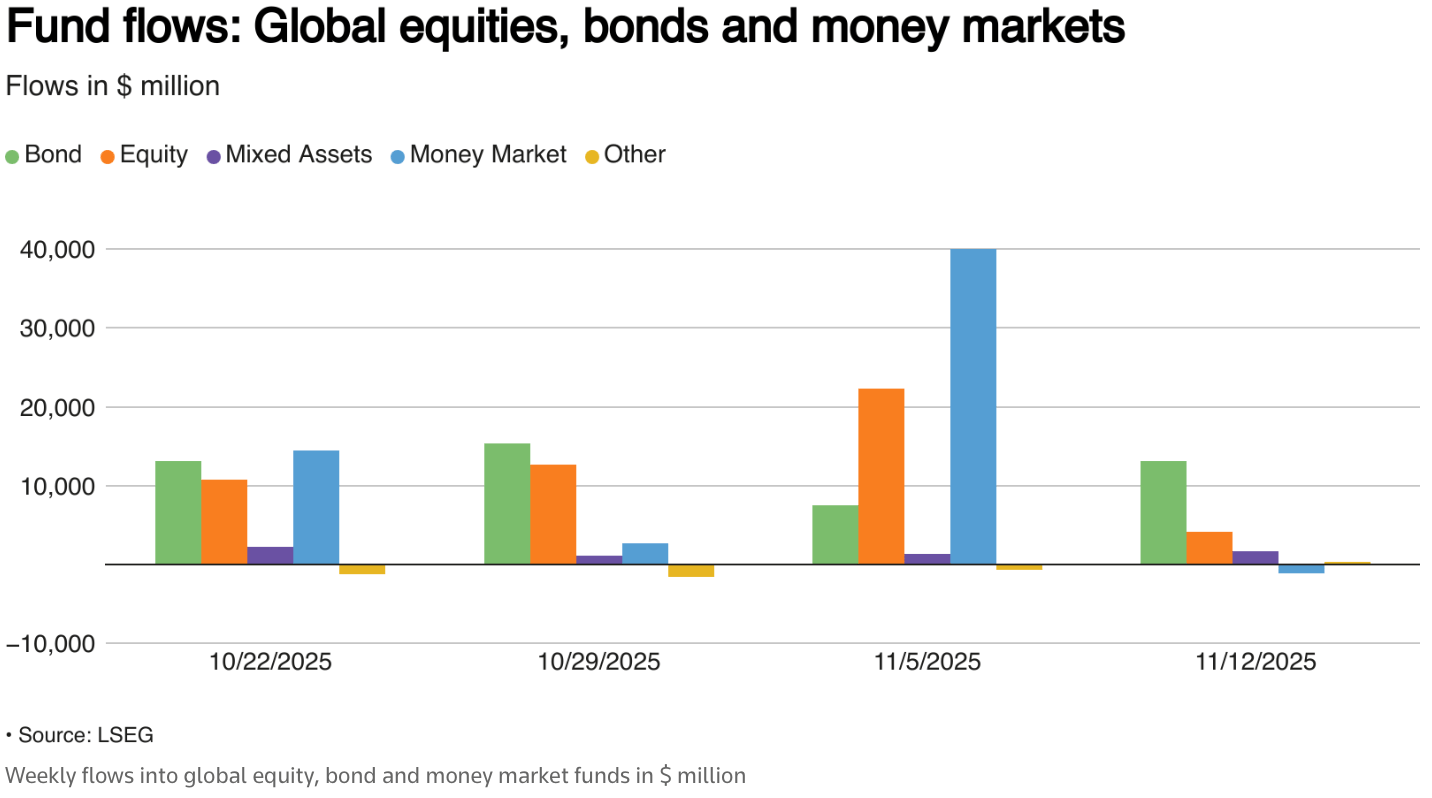 Global equity inflows dropped sharply in the week to November 12, falling to just $4.11B from $22.27B the week before, as worries over stretched tech valuations and signs of a weakening U.S. labor market pushed investors into risk-off mode. Sentiment worsened after a private report suggested U.S. job losses in October and after SoftBank disclosed a $5.83B sale of Nvidia shares. Regionally, Asian equity funds led with $3.04B in inflows, the U.S. saw $1.15B, while Europe posted $1.87B in outflows