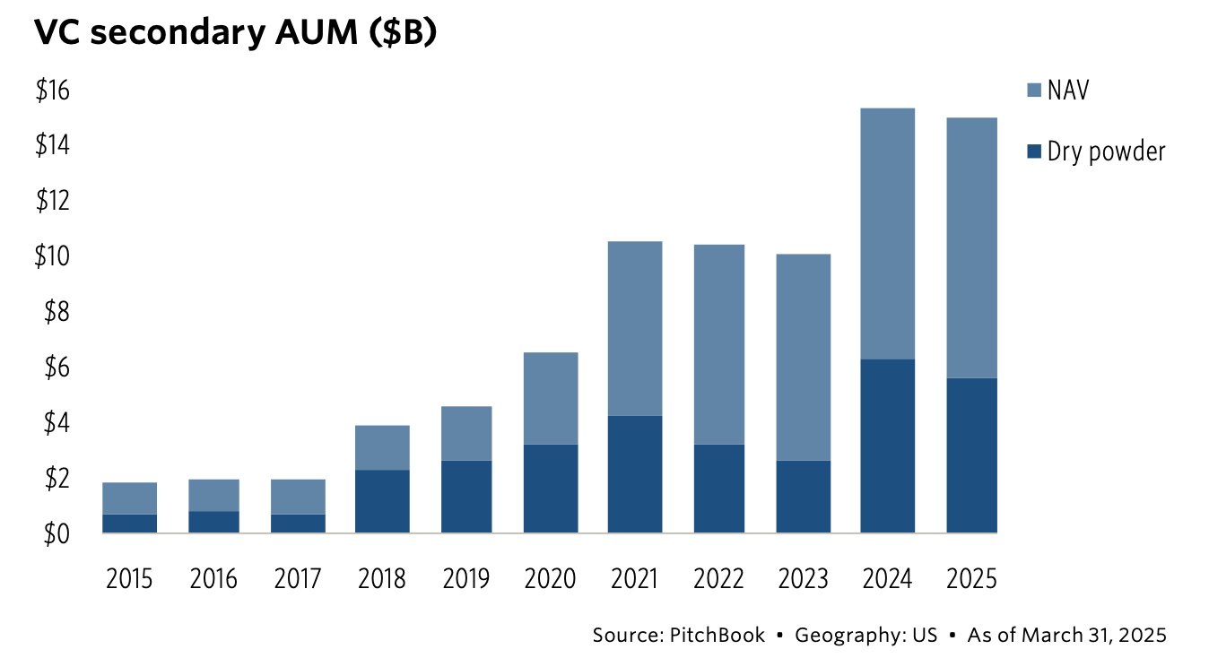 Dry powder for dedicated venture secondary funds totaled $5.7B as of March 2025, but that’s only 1.8% of the capital sitting in primary VC funds, showing how small the secondary pool still is compared with the broader venture market