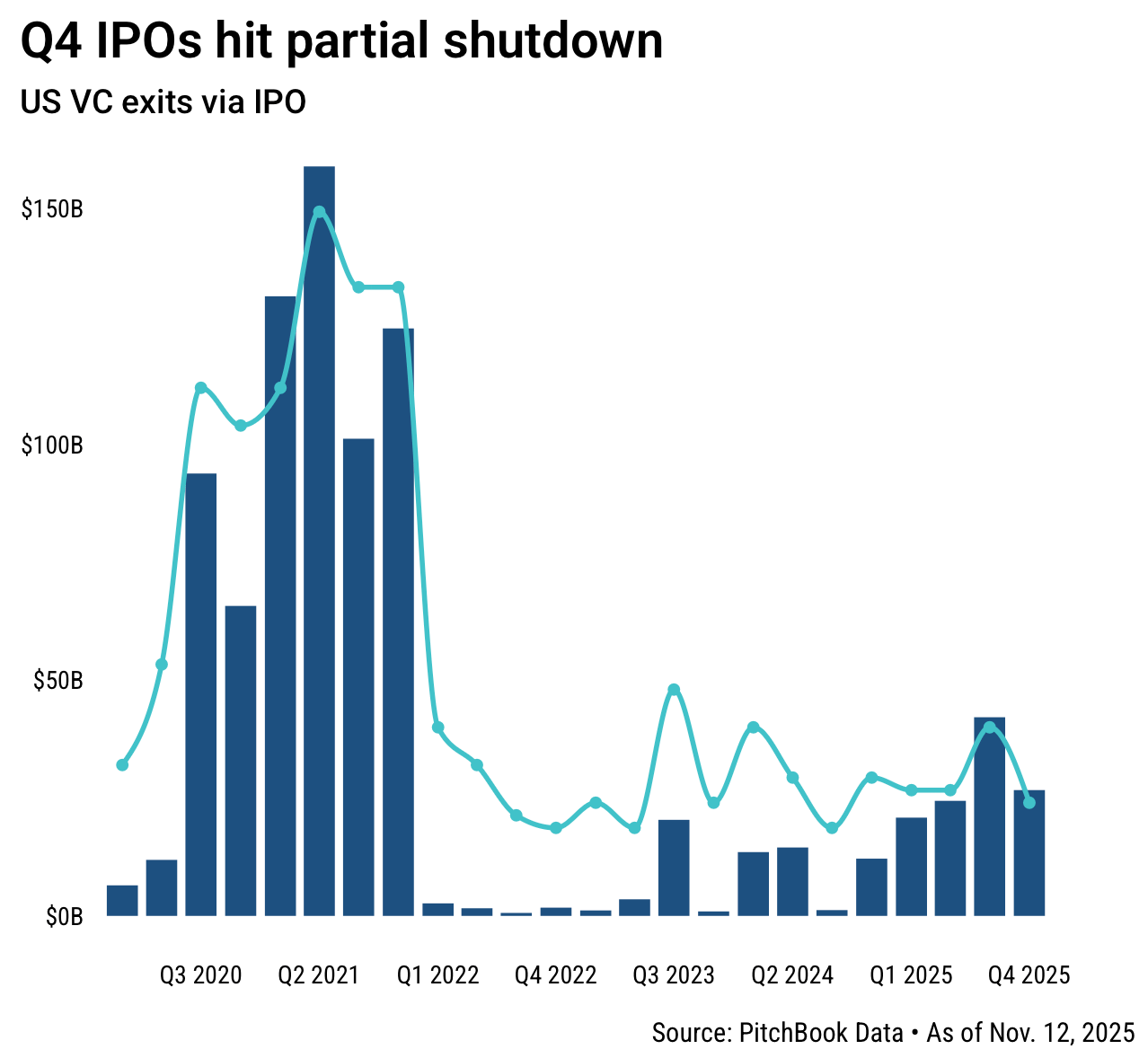 The 43-day U.S. government shutdown is over, but an IPO rebound is unlikely in the near term. Bankers note that even with the SEC reopening, companies can’t “rush out” to go public. Q4 IPO momentum, already weak, has been further derailed. This comes after Q3 delivered the strongest IPO quarter in nearly four years, with 15 VC-backed IPOs generating $42.1 billion in exit value. But shutdown-era listings have struggled: Navan fell 20% on its first day