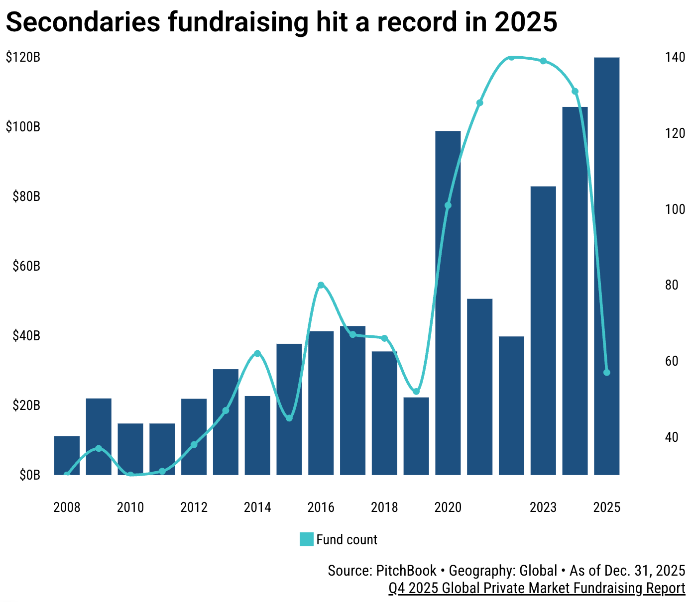 Global secondary transaction volume reached a record $240B in 2025 (up 48% year-over-year), while fundraising hit $120B, also a record