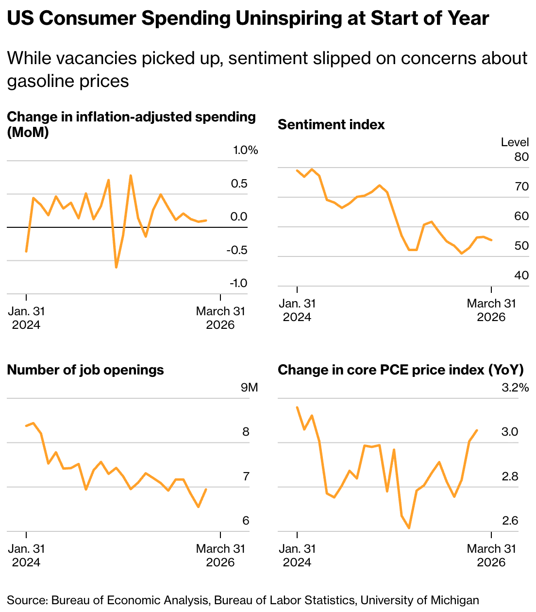 US Economy Lost Some Momentum, Inflation Held Firm Ahead of War (Bloomberg, 4 minute read)