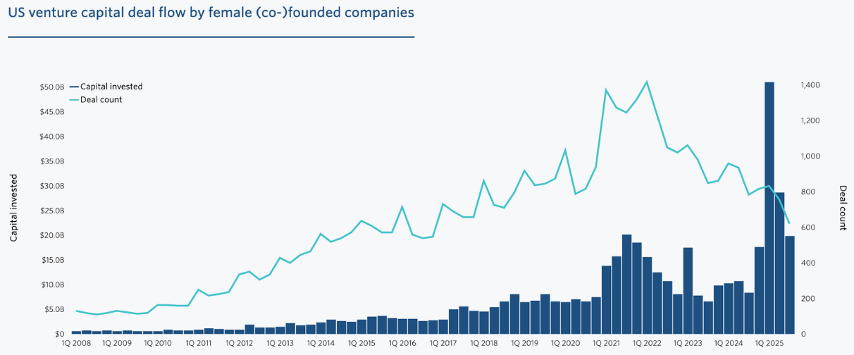So far in 2025, female-only founded companies have captured 5.8% of total deal count, while female-and-male co-led teams account for 17.5%