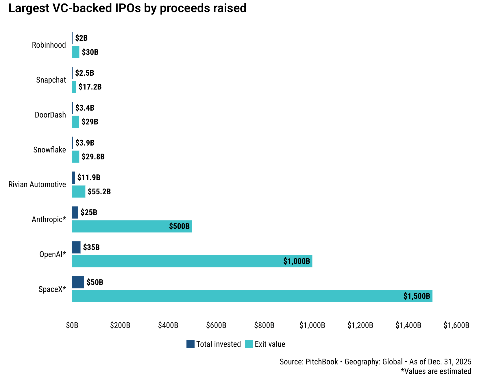 The 2026 IPO market, expected to rebound, may instead be dominated by three mega-listings, SpaceX ($1.25T), OpenAI ($840B), and Anthropic ($330B), which together could raise $100B+ and represent a combined ~$2.4T valuation, exceeding the total value of all U.S. VC-backed IPOs since 2000. While this would be a major win for venture capital, it could concentrate liquidity among a few players, strain underwriters, and absorb public market capital, crowding out other unicorns