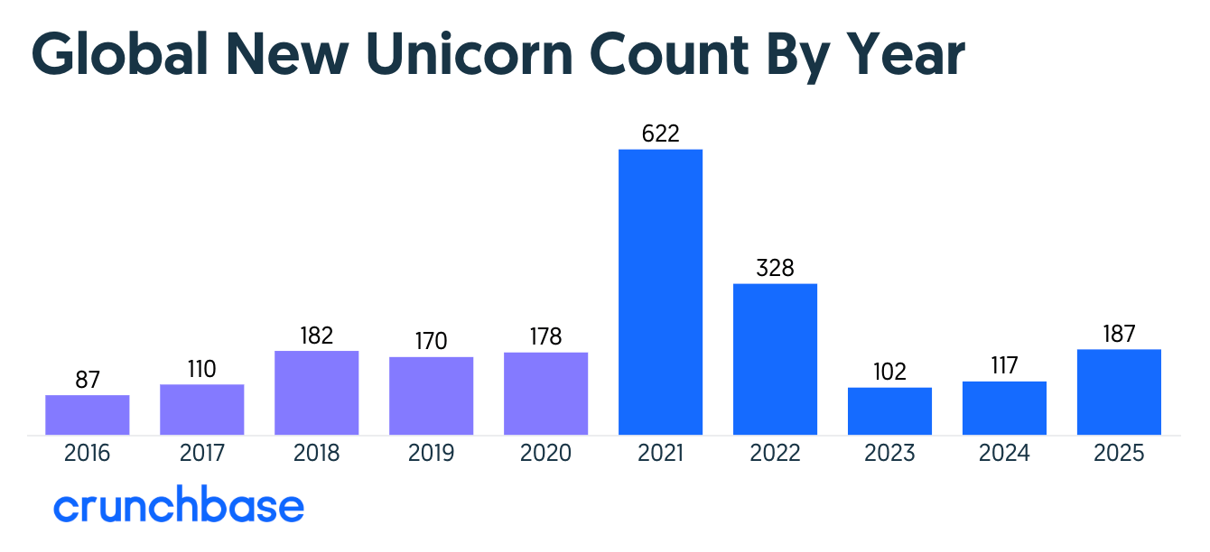 Unicorn creation surged in 2025, with 187 new billion-dollar startups (+61% YoY), marking a strong rebound above post-pandemic levels and slightly ahead of pre-2020 norms. Growth was fueled by AI, which produced 47 new unicorns (25%), a share expected to rise further. Notably, 94 companies (~50%) reached unicorn status in under 5 years, signaling faster scaling cycles