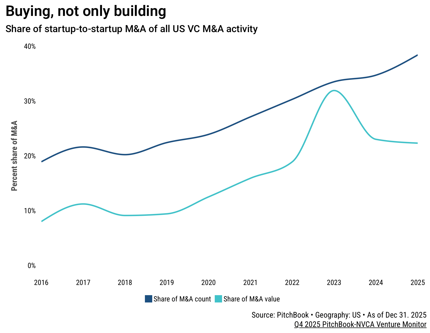 Startup-to-startup M&A hit record levels in 2025, accounting for 38.4% of all acquisitions of U.S. VC-backed companies, according to PitchBook-NVCA. Of 1,009 total M&A deals, 387 involved VC-backed buyers, representing $31.1 billion of the year’s $139.1 billion in deal value, the highest since 2021. The trend reflects fast-growing, well-capitalized startups, many in AI, using acquisitions to stay competitive, absorb talent, and extend product capabilities
