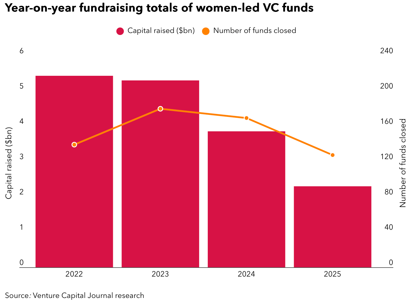 While women-led funds’ share of total VC fundraising peaked at 3.7% in 2023, it fell to 3.01% in 2024 and declined again in 2025